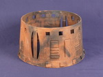2005Etnisch,kokervormig object met scherpe inscripties,zoals te zien bij de precolumbiaanse kunst in mexico. Gebakken in houtskool,waardoor de ijzeroxide op de "huid" een levendig kleurenpatoon tonen.